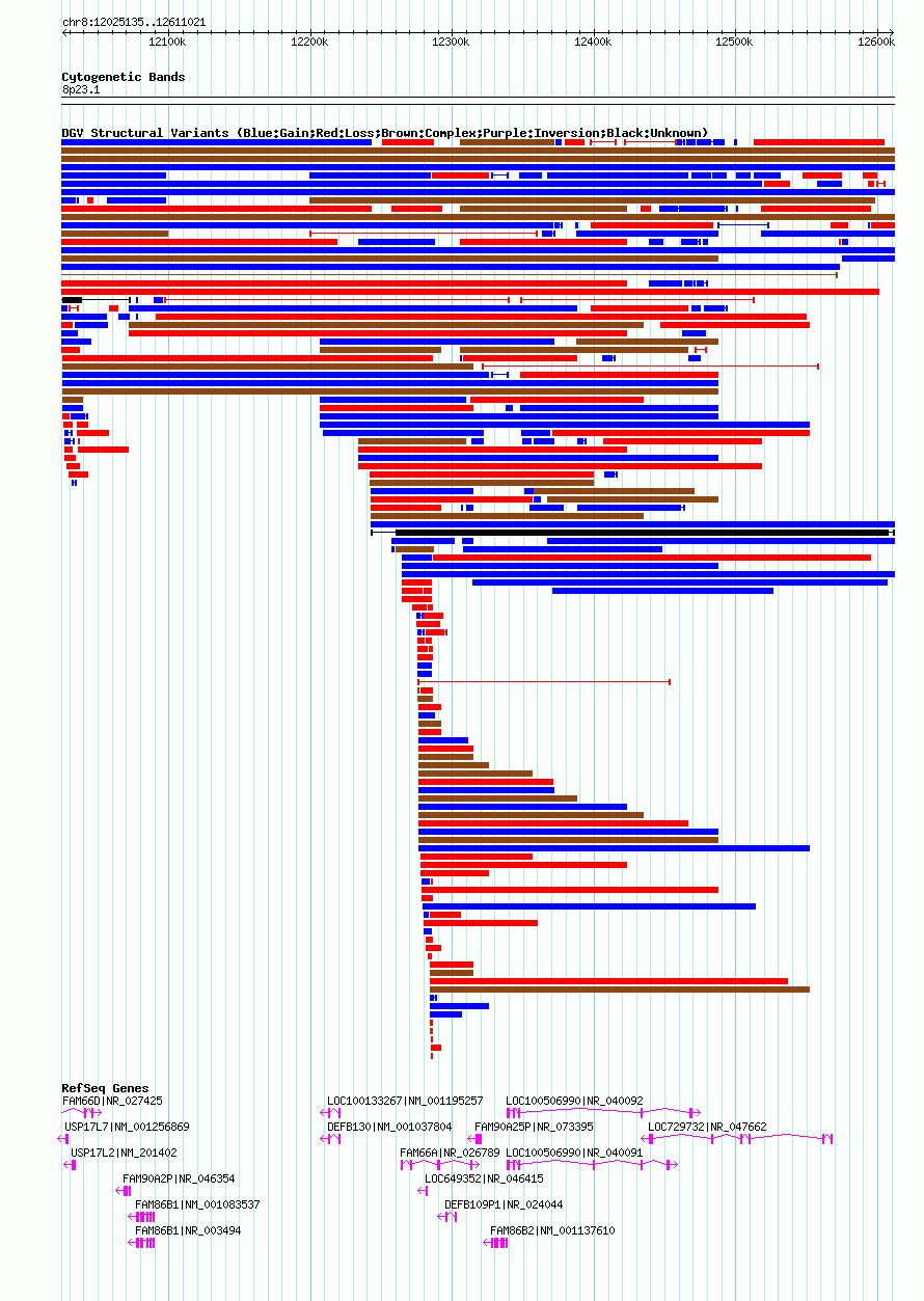 Variant DetailsVariant: essv6992494| Internal ID | 10369573 | | Landmark | | | Location Information | | | Cytoband | 8p23.1 | | Allele length | | Assembly | Allele length | | hg38 | 578925 | | hg19 | 578925 | | hg18 | 585887 |