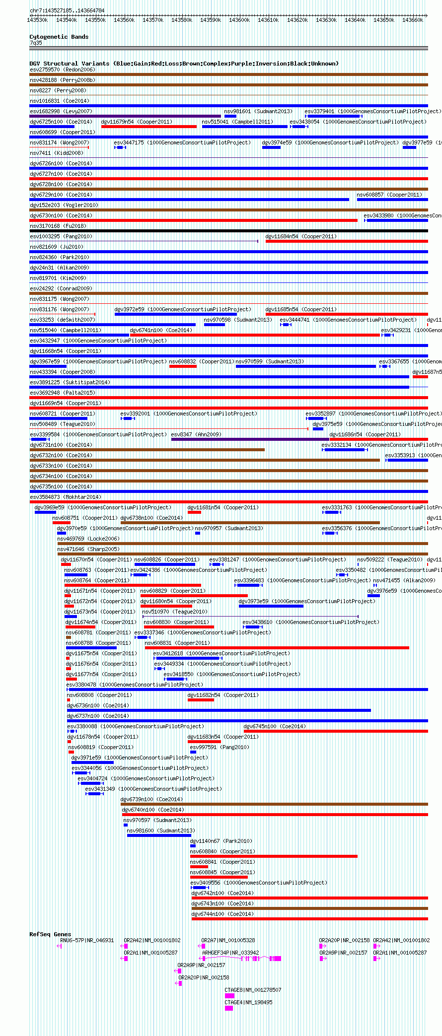 Variant DetailsVariant: essv7015453| Internal ID | 10344379 | | Landmark | | | Location Information | | | Cytoband | 7q35 | | Allele length | | Assembly | Allele length | | hg38 | 137600 | | hg19 | 137600 | | hg18 | 137600 |