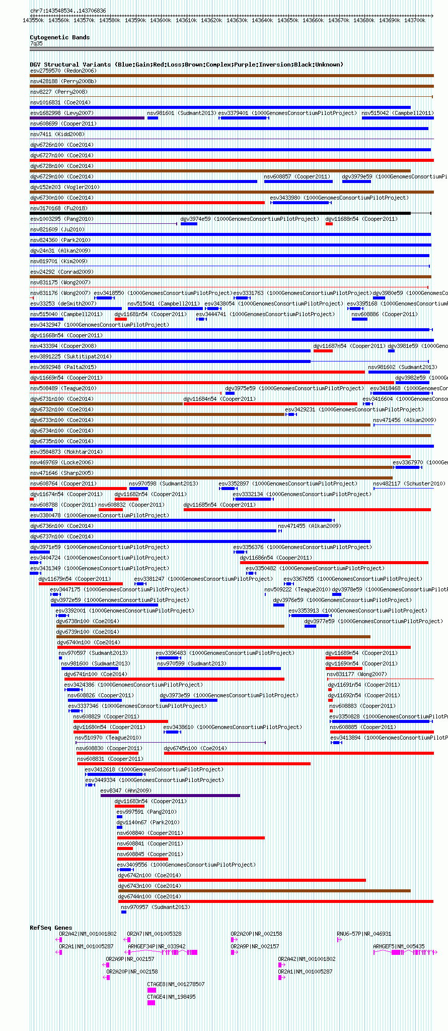 Variant DetailsVariant: essv7015526| Internal ID | 10350279 | | Landmark | | | Location Information | | | Cytoband | 7q35 | | Allele length | | Assembly | Allele length | | hg38 | 158303 | | hg19 | 158303 | | hg18 | 158303 |