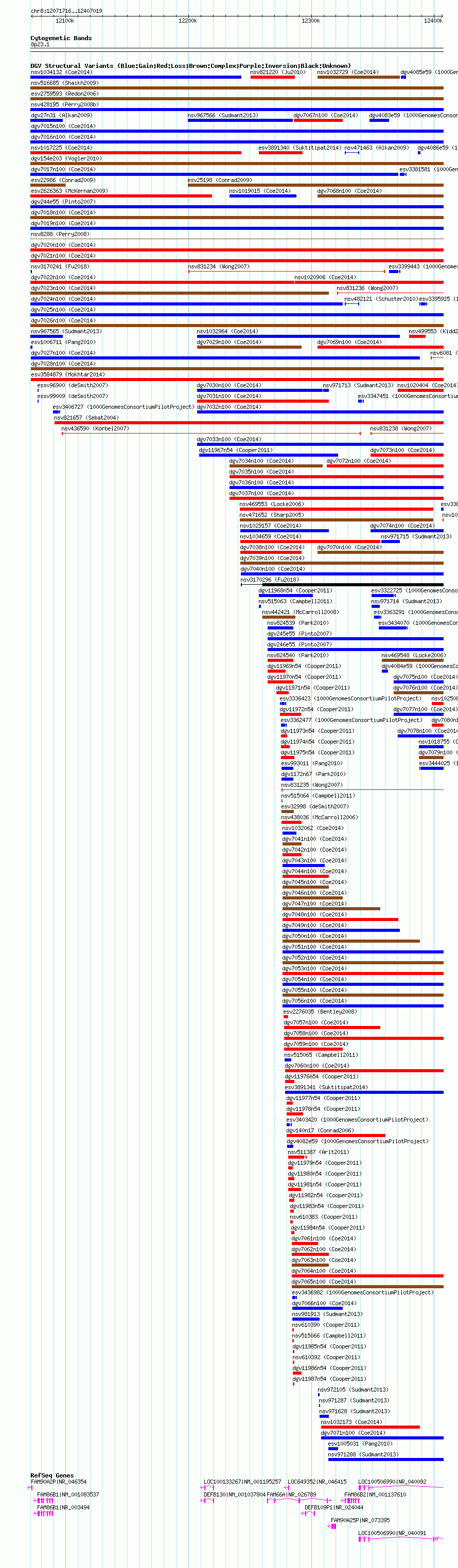 | | Variant Type | CNV gain | | Copy Number | | | Allele State | | | Allele Origin | | | Probe Count | | | Validation Flag | | | Merged Status | S | | Merged Variants | esv2761239 | | Supporting Variants | | | Samples | RW_0650 | | Known Genes | DEFB109P1, DEFB130, FAM66A, FAM86B1, FAM86B2, FAM90A25P, FAM90A2P, LOC100133267, LOC100506990, LOC649352 | | Method | Merging | | Analysis | Two different algorithms (PennCNV and Birdseye) were applied to detect CNVs. Only congruent CNV events regarding direction of effect that were detected by both algorithms were merged using the outer borders of the event in a first step. In a second step only CNVs that were detected in at least two individuals were merged into a CNVR. | | Platform | Merging | | Comments | | | Reference | Vogler_et_al_2010 | | Pubmed ID | 21179565 | | Accession Number(s) | essv7016125