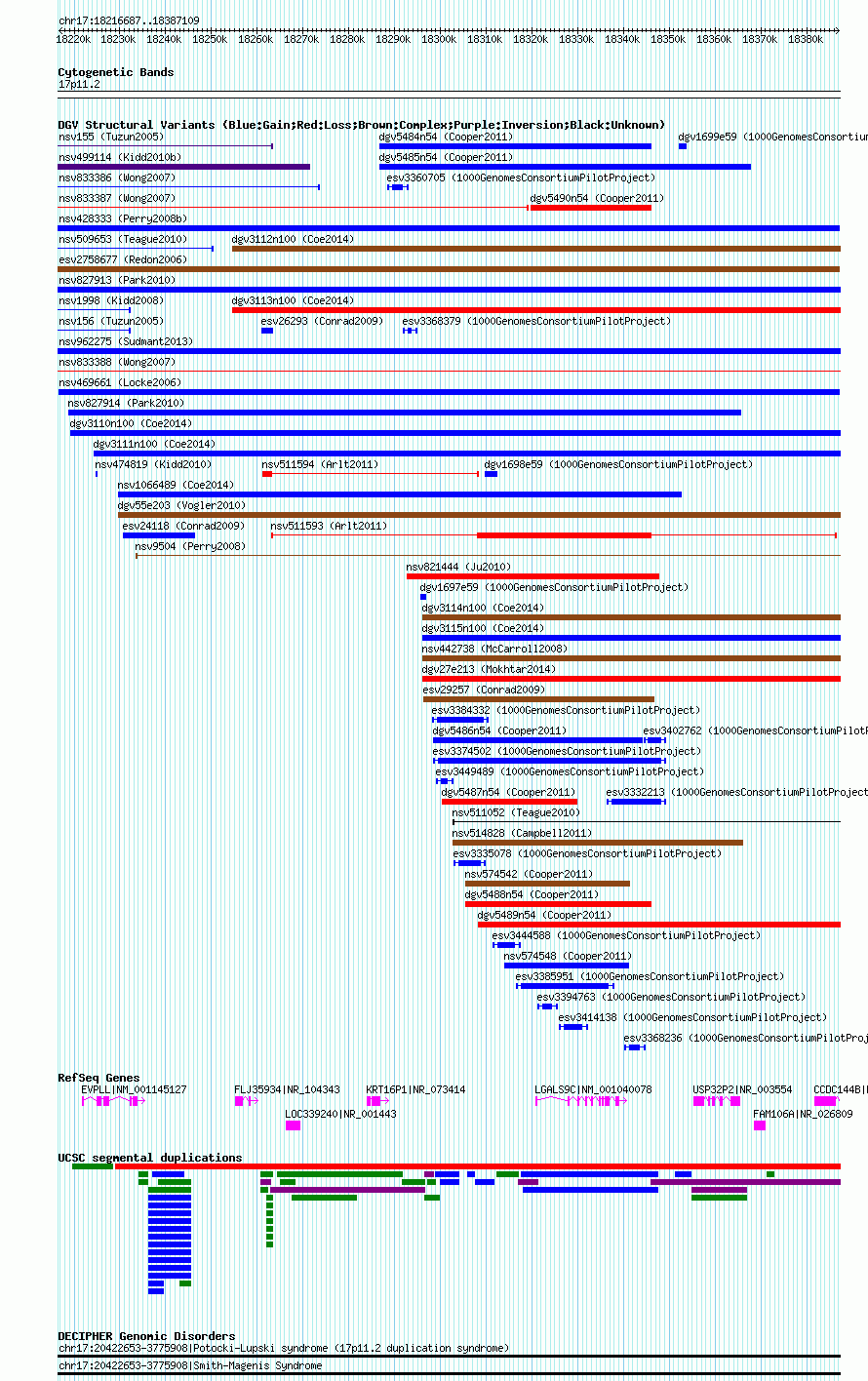 Variant DetailsVariant: essv8430| Internal ID | 9630452 | | Landmark | | | Location Information | | | Cytoband | 17p11.2 | | Allele length | | Assembly | Allele length | | hg38 | 170423 | | hg19 | 170423 | | hg18 | 170423 | | hg17 | 170423 |