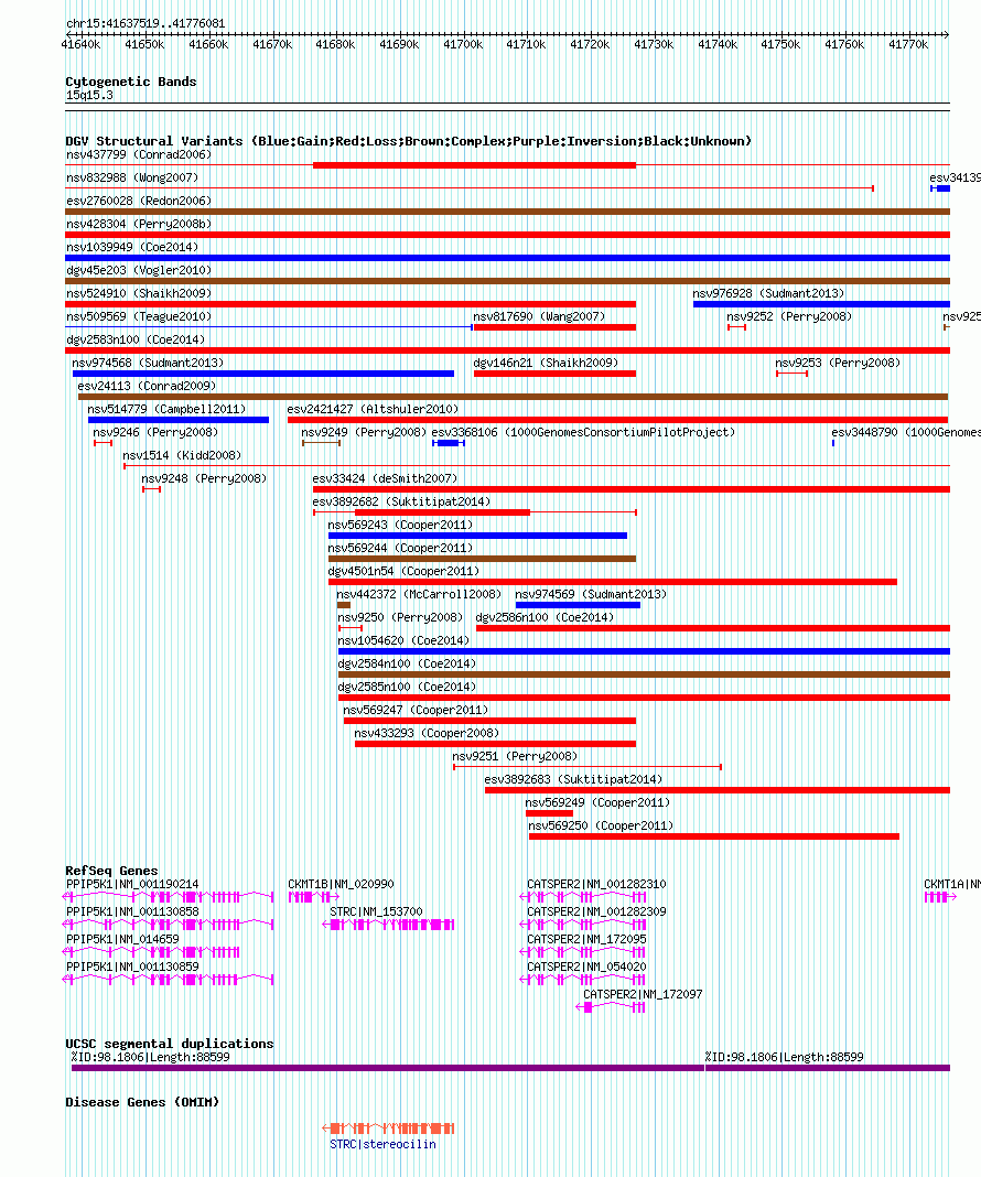 | | Variant Type | CNV loss | | Copy Number | | | Allele State | | | Allele Origin | | | Probe Count | | | Validation Flag | | | Merged Status | S | | Merged Variants | esv33424 | | Supporting Variants | | | Samples | 22231 | | Known Genes | CATSPER2, CKMT1A, CKMT1B, PPIP5K1, RNU6-28P, STRC | | Method | Oligo aCGH | | Analysis | Data from the focused confirmation array were analysed using the ADM-2 algorithm at threshold 4. The ADM-2 algorithm uses log2 ratios weighted by log2 ratio error as calculated by Feature Extraction software to identify genomic intervals with copy number differences between the sample and the reference. Data were centralized, and calls with average log2 ratios less than 0.3 were excluded from the analysis, as were any calls detected by probes containing a known SNP that may alter an AluI or RsaI restriction site as determined by the 9.3 million in the UCSC annotation database for the genome browser (Karolchik D. et al. The UCSC Genome Browser Database. Nucleic Acids Res. (2003) 31:51-54.). The false-positive rate for the ADM-2 algorithm at threshold 4 was determined using three self-self hybridizations of the reference sample. In the three replicate self-self experiments, ADM-2 analysis with threshold 4 identified an average of 29.6 single-probe intervals and 10.3 multi-probe intervals. Comparing the average number of variant interval calls in self-self experiments with the average number of variant interval calls for each sample, we estimated the false-positive rate to be 0.05 (10.3/197) for multi-probe calls and 0.04 (29.6/669) for single-probe calls. The false-negative rate was estimated in a manner similar to that described by Wong et al. (Wong et al. A comprehensive analysis of common copy-number variations in the human genome. Am. J. Hum. Genet. (2007) 80:91-104.) based on four replicate experiments for one of the samples. In four replicate experiments, 223 putative variant intervals were observed two or more times and were considered true calls (49 intervals were observed twice, 43 intervals were observed three times and 131 intervals were observed four times), yielding an estimate of false-negative rate of 0.16 [(2*49+43)/(4*223)=0.16]. In this analysis, we conservatively considered aberrant intervals in two experiments the same if they overlapped by more than 0.9. | | Platform | Agilent-015366 Custom Human 244K CGH Microarray | | Comments | | | Reference | de_Smith_et_al_2007 | | Pubmed ID | 17666407 | | Accession Number(s) | essv94893