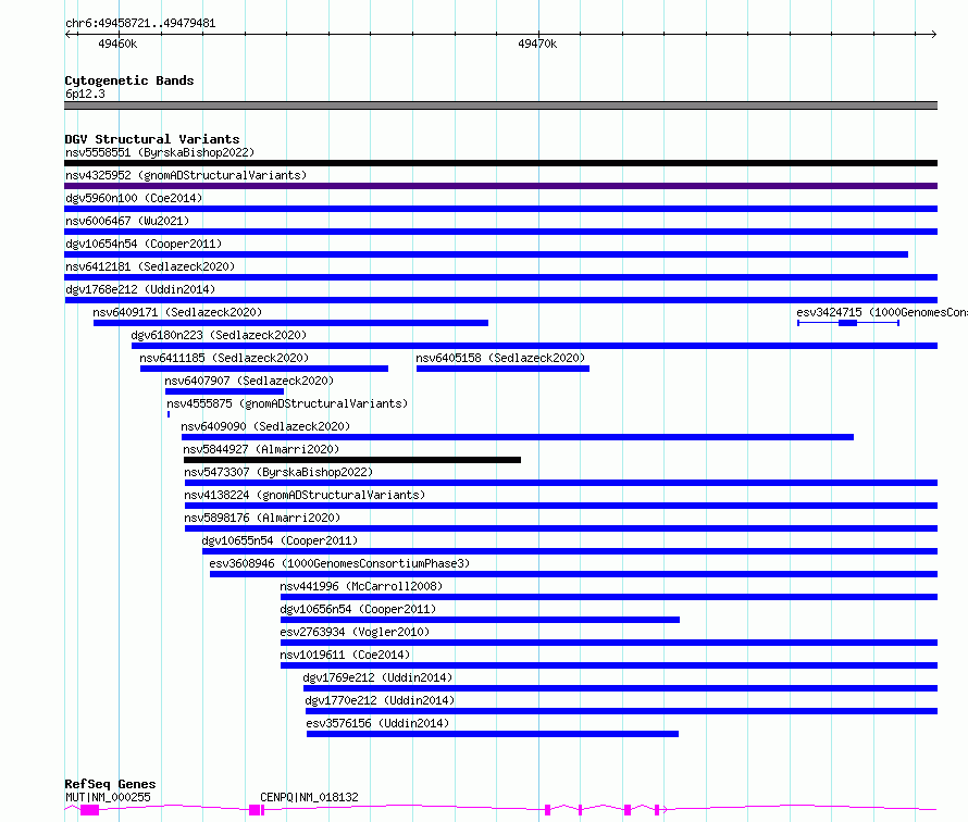 Variant DetailsVariant: essv9779271| Internal ID | 18675507 | | Landmark | | | Location Information | | | Cytoband | 6p12.3 | | Allele length | | Assembly | Allele length | | hg38 | 20761 | | hg19 | 20761 |