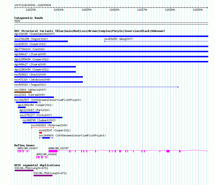 | Variant Type | CNV loss | Copy Number | | Allele State | | Allele Origin | | Probe Count | | Validation Flag | | Merged Status | S | Merged Variants | esv33804 | Supporting Variants | | Samples | 21938 | Known Genes | AKNA, ORM1, ORM2 | Method | Oligo aCGH | Analysis | Data from the focused confirmation array were analysed using the ADM-2 algorithm at threshold 4. The ADM-2 algorithm uses log2 ratios weighted by log2 ratio error as calculated by Feature Extraction software to identify genomic intervals with copy number differences between the sample and the reference. Data were centralized, and calls with average log2 ratios less than 0.3 were excluded from the analysis, as were any calls detected by probes containing a known SNP that may alter an AluI or RsaI restriction site as determined by the 9.3 million in the UCSC annotation database for the genome browser (Karolchik D. et al. The UCSC Genome Browser Database. Nucleic Acids Res. (2003) 31:51-54.). The false-positive rate for the ADM-2 algorithm at threshold 4 was determined using three self-self hybridizations of the reference sample. In the three replicate self-self experiments, ADM-2 analysis with threshold 4 identified an average of 29.6 single-probe intervals and 10.3 multi-probe intervals. Comparing the average number of variant interval calls in self-self experiments with the average number of variant interval calls for each sample, we estimated the false-positive rate to be 0.05 (10.3/197) for multi-probe calls and 0.04 (29.6/669) for single-probe calls. The false-negative rate was estimated in a manner similar to that described by Wong et al. (Wong et al. A comprehensive analysis of common copy-number variations in the human genome. Am. J. Hum. Genet. (2007) 80:91-104.) based on four replicate experiments for one of the samples. In four replicate experiments, 223 putative variant intervals were observed two or more times and were considered true calls (49 intervals were observed twice, 43 intervals were observed three times and 131 intervals were observed four times), yielding an estimate of false-negative rate of 0.16 [(2*49+43)/(4*223)=0.16]. In this analysis, we conservatively considered aberrant intervals in two experiments the same if they overlapped by more than 0.9. | Platform | Agilent-015366 Custom Human 244K CGH Microarray | Comments | | Reference | de_Smith_et_al_2007 | Pubmed ID | 17666407 | Accession Number(s) | essv99095