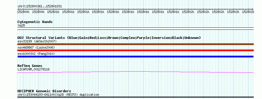 | Variant Type | CNV gain | Copy Number | | Allele State | | Allele Origin | | Probe Count | | Validation Flag | | Merged Status | M | Merged Variants | | Supporting Variants | essv3586861 | Samples | HuRef | Known Genes | L1CAM | Method | Oligo aCGH | Analysis | | Platform | Not Submitted | Comments | | Reference | Pang_et_al_2010 | Pubmed ID | 20482838 | Accession Number(s) | esv1000302