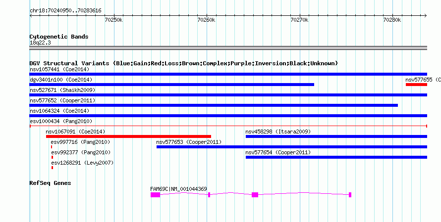 Variant DetailsVariant: esv1000434| Internal ID | 7065564 | | Landmark | | | Location Information | | | Cytoband | 18q22.3 | | Allele length | | Assembly | Allele length | | hg38 | 42667 | | hg19 | 42667 | | hg18 | 42667 |