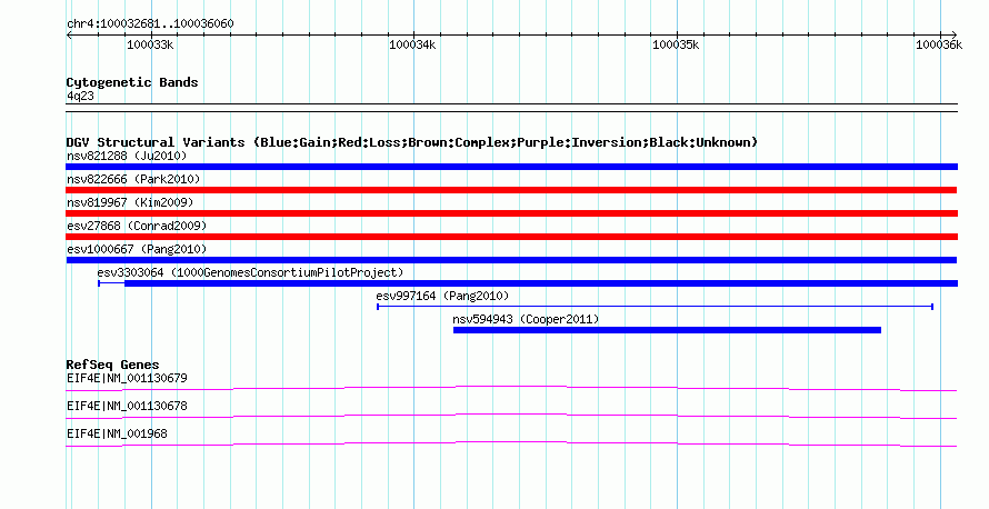 Variant DetailsVariant: esv1000667| Internal ID | 6712809 | | Landmark | | | Location Information | | | Cytoband | 4q23 | | Allele length | | Assembly | Allele length | | hg38 | 3380 | | hg19 | 3380 | | hg18 | 3380 |