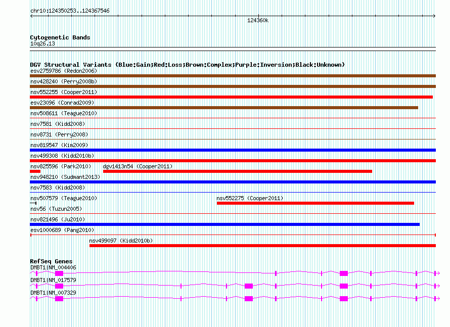 | | Variant Type | CNV deletion | | Copy Number | | | Allele State | | | Allele Origin | | | Probe Count | | | Validation Flag | | | Merged Status | M | | Merged Variants | | | Supporting Variants | essv3565003 | | Samples | HuRef | | Known Genes | DMBT1 | | Method | Sequencing | | Analysis | | | Platform | Sanger Sequencing | | Comments | | | Reference | Pang_et_al_2010 | | Pubmed ID | 20482838 | | Accession Number(s) | esv1000689