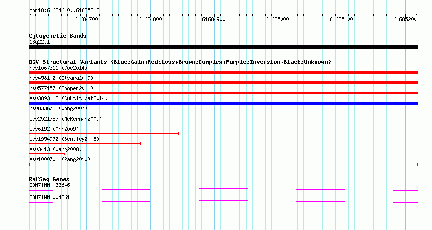 Variant DetailsVariant: esv1000701| Internal ID | 7065831 | | Landmark | | | Location Information | | | Cytoband | 18q22.1 | | Allele length | | Assembly | Allele length | | hg38 | 609 | | hg19 | 609 | | hg18 | 609 |