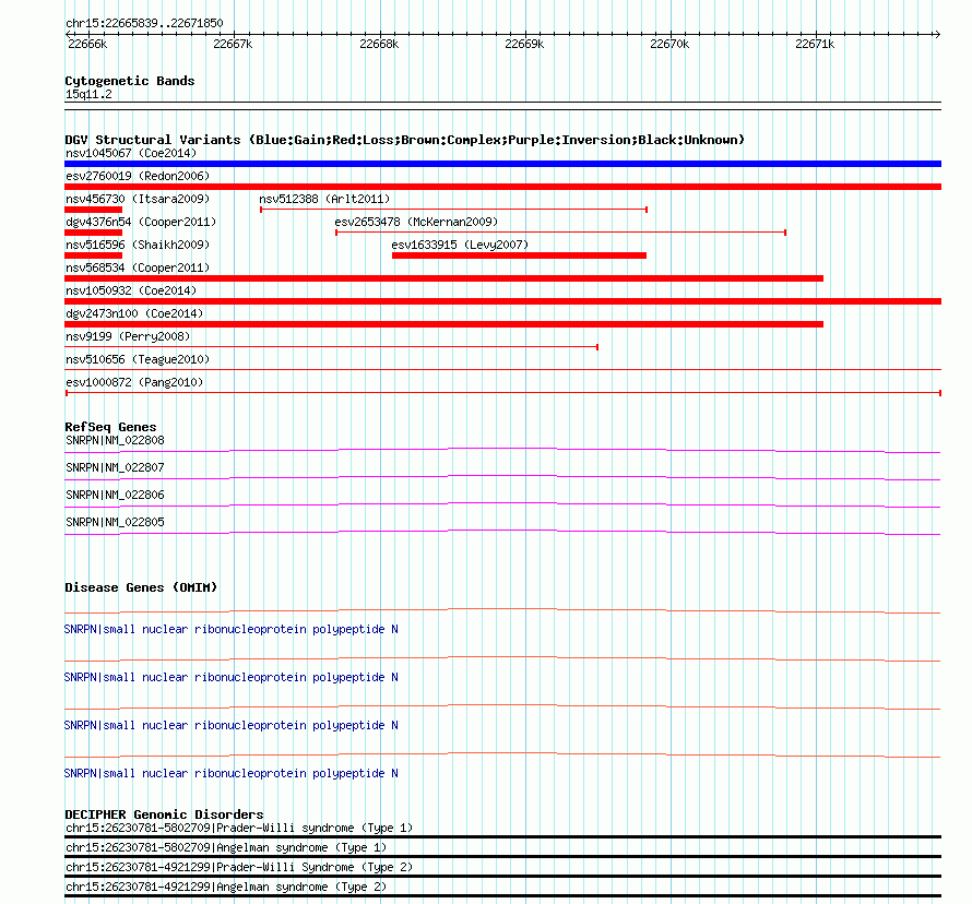 Variant DetailsVariant: esv1000872| Internal ID | 7066001 | | Landmark | | | Location Information | | | Cytoband | 15q11.2 | | Allele length | | Assembly | Allele length | | hg38 | 6012 | | hg19 | 6012 | | hg18 | 6012 |