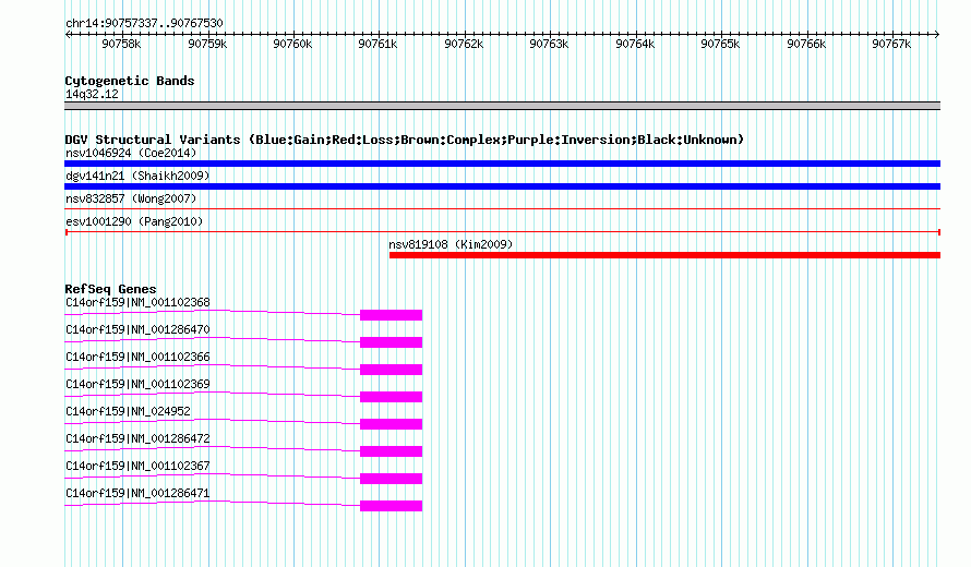 Variant DetailsVariant: esv1001290| Internal ID | 7066417 | | Landmark | | | Location Information | | | Cytoband | 14q32.11 | | Allele length | | Assembly | Allele length | | hg38 | 10194 | | hg19 | 10194 | | hg18 | 10194 |