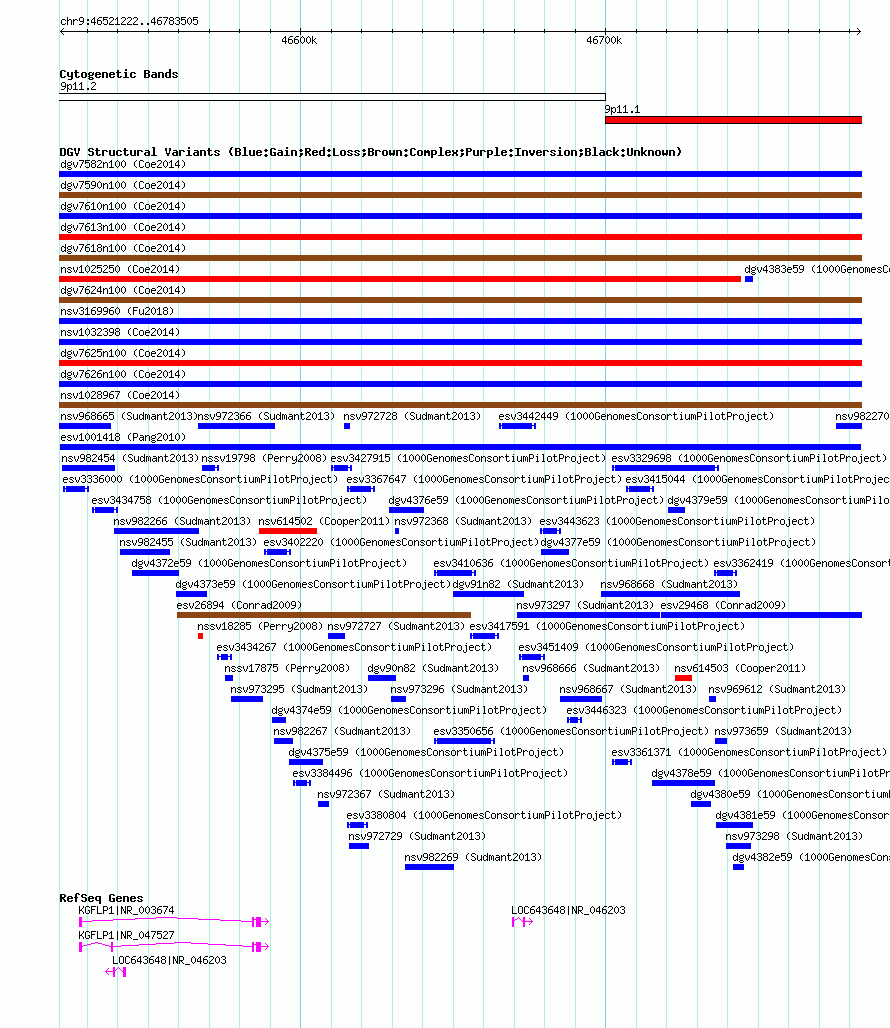 Variant DetailsVariant: esv1001418| Internal ID | 7066544 | | Landmark | | | Location Information | | | Cytoband | 9p11.1 | | Allele length | | Assembly | Allele length | | hg38 | 262460 | | hg19 | 262460 | | hg18 | 262284 |