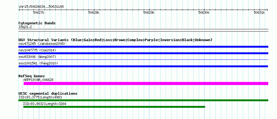 Variant DetailsVariant: esv1001541| Internal ID | 6713677 | | Landmark | | | Location Information | | | Cytoband | 15q21.2 | | Allele length | | Assembly | Allele length | | hg38 | 4515 | | hg19 | 4515 | | hg18 | 4515 |