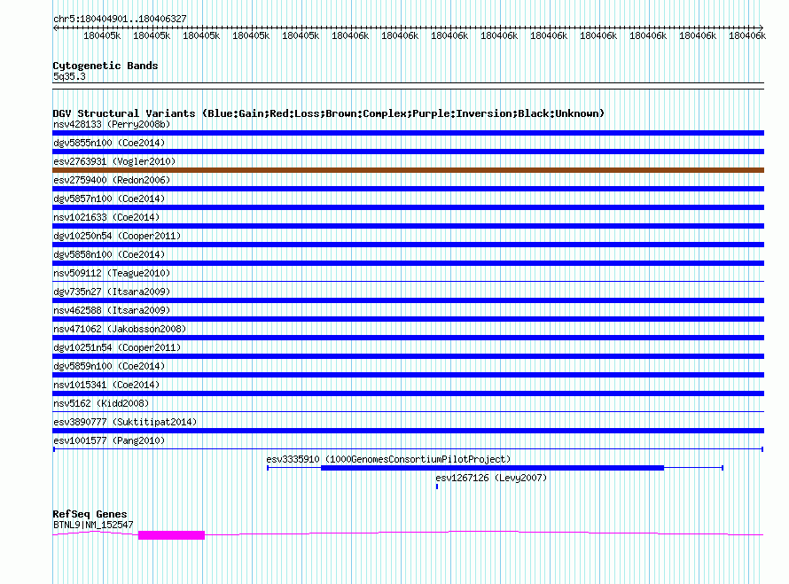 Variant DetailsVariant: esv1001577| Internal ID | 7066701 | | Landmark | | | Location Information | | | Cytoband | 5q35.3 | | Allele length | | Assembly | Allele length | | hg38 | 4564 | | hg19 | 4564 | | hg18 | 4564 |