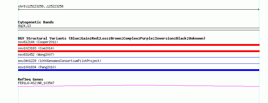 Variant DetailsVariant: esv1001834| Internal ID | 7066953 | | Landmark | | | Location Information | | | Cytoband | 8q24.13 | | Allele length | | Assembly | Allele length | | hg38 | 70 | | hg19 | 70 | | hg18 | 70 |