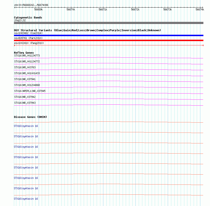 | | Variant Type | CNV deletion | | Copy Number | | | Allele State | | | Allele Origin | | | Probe Count | | | Validation Flag | | | Merged Status | M | | Merged Variants | | | Supporting Variants | essv3564239 | | Samples | HuRef | | Known Genes | STX16, STX16-NPEPL1 | | Method | Sequencing | | Analysis | | | Platform | Sanger Sequencing | | Comments | | | Reference | Pang_et_al_2010 | | Pubmed ID | 20482838 | | Accession Number(s) | esv1002410