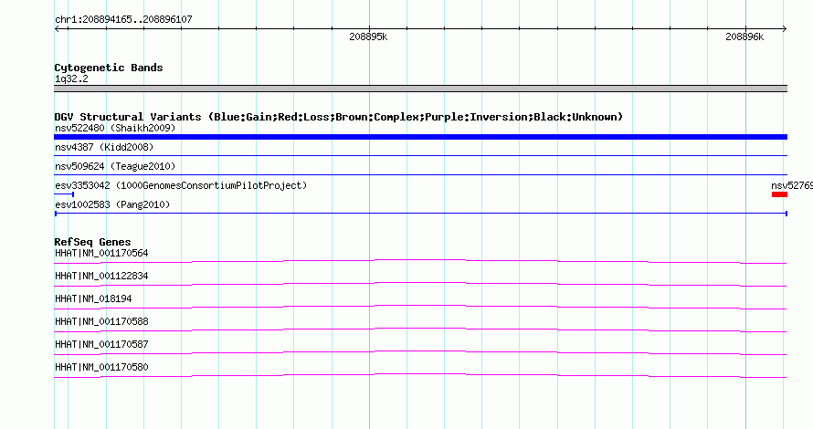| | Variant Type | CNV insertion | | Copy Number | | | Allele State | | | Allele Origin | | | Probe Count | | | Validation Flag | | | Merged Status | M | | Merged Variants | | | Supporting Variants | essv3563844 | | Samples | HuRef | | Known Genes | HHAT | | Method | Sequencing | | Analysis | | | Platform | Sanger Sequencing | | Comments | | | Reference | Pang_et_al_2010 | | Pubmed ID | 20482838 | | Accession Number(s) | esv1002583