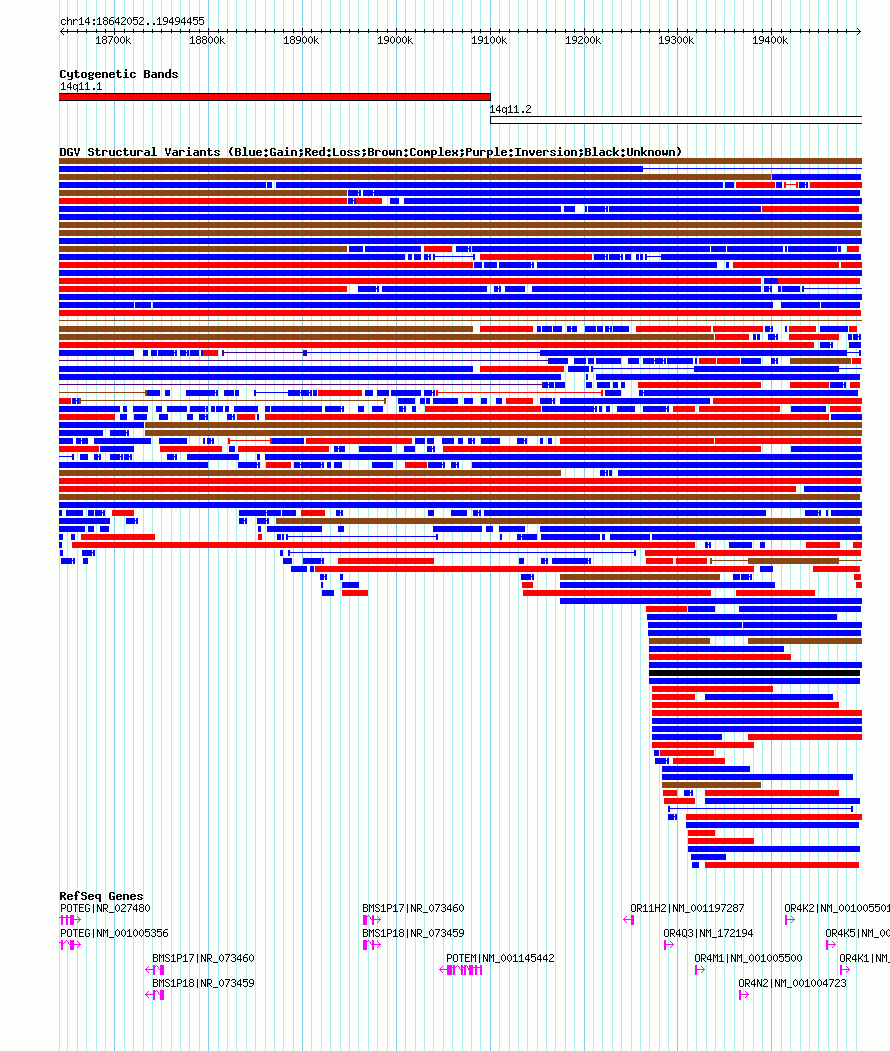 Variant DetailsVariant: esv1003217| Internal ID | 7068326 | | Landmark | | | Location Information | | | Cytoband | 14q11.1 | | Allele length | | Assembly | Allele length | | hg38 | 970353 | | hg19 | 852564 | | hg18 | 852404 |