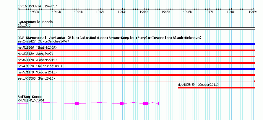 | | Variant Type | CNV deletion | | Copy Number | | | Allele State | | | Allele Origin | | | Probe Count | | | Validation Flag | | | Merged Status | M | | Merged Variants | | | Supporting Variants | essv3565731 | | Samples | HuRef | | Known Genes | RPL3L | | Method | Sequencing | | Analysis | | | Platform | Sanger Sequencing | | Comments | | | Reference | Pang_et_al_2010 | | Pubmed ID | 20482838 | | Accession Number(s) | esv1003583