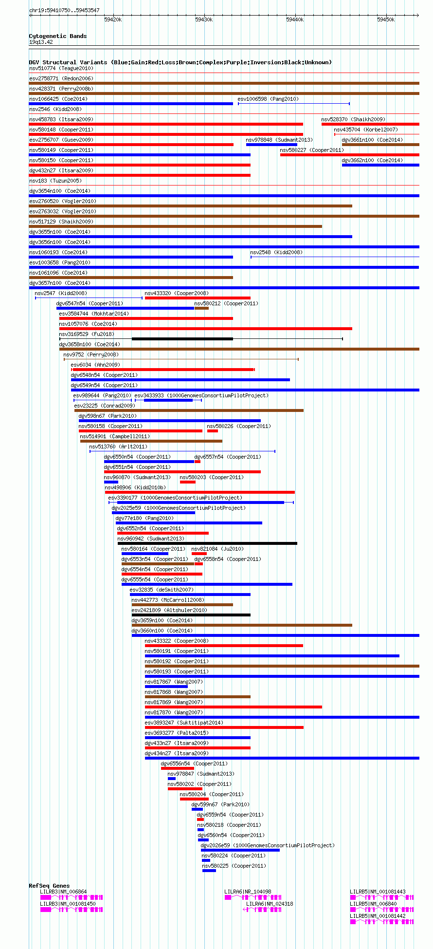 Variant DetailsVariant: esv1003658| Internal ID | 7068763 | | Landmark | | | Location Information | | | Cytoband | 19q13.42 | | Allele length | | Assembly | Allele length | | hg38 | 42804 | | hg19 | 42798 | | hg18 | 42798 |
