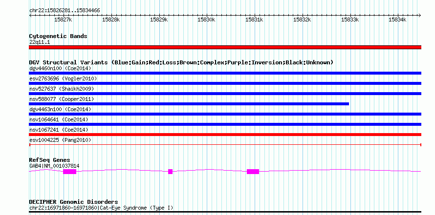Variant DetailsVariant: esv1004225| Internal ID | 7069326 | | Landmark | | | Location Information | | | Cytoband | 22q11.1 | | Allele length | | Assembly | Allele length | | hg38 | 8186 | | hg19 | 8186 | | hg18 | 8186 |