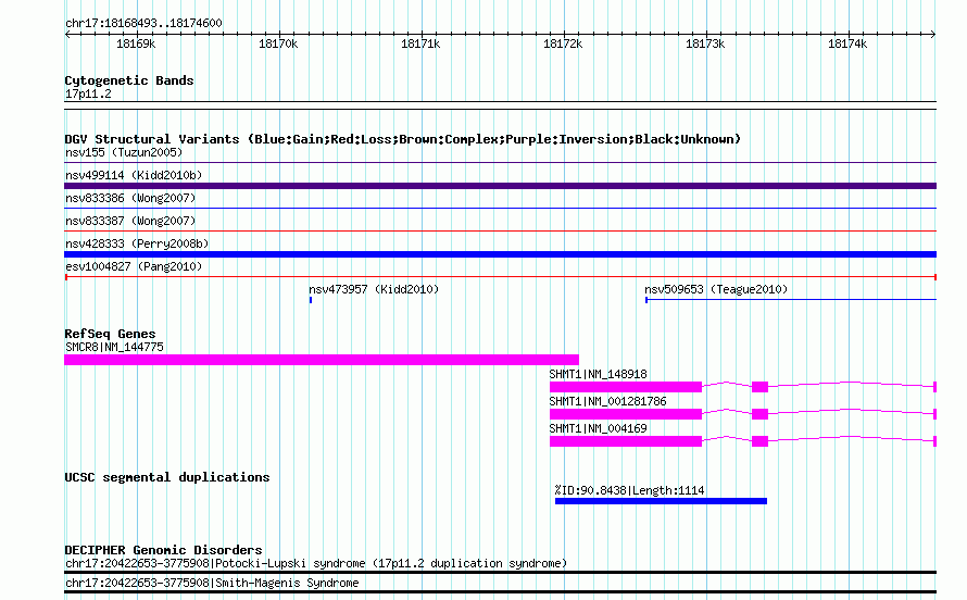 Variant DetailsVariant: esv1004827| Internal ID | 6716950 | | Landmark | | | Location Information | | | Cytoband | 17p11.2 | | Allele length | | Assembly | Allele length | | hg38 | 6108 | | hg19 | 6108 | | hg18 | 6108 |