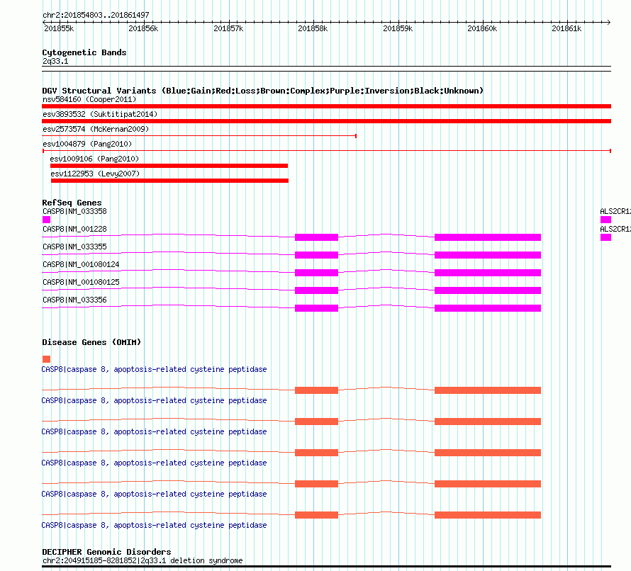 | | Variant Type | CNV deletion | | Copy Number | | | Allele State | | | Allele Origin | | | Probe Count | | | Validation Flag | | | Merged Status | M | | Merged Variants | | | Supporting Variants | essv3564666 | | Samples | HuRef | | Known Genes | ALS2CR12, CASP8 | | Method | Sequencing | | Analysis | | | Platform | Sanger Sequencing | | Comments | | | Reference | Pang_et_al_2010 | | Pubmed ID | 20482838 | | Accession Number(s) | esv1004879