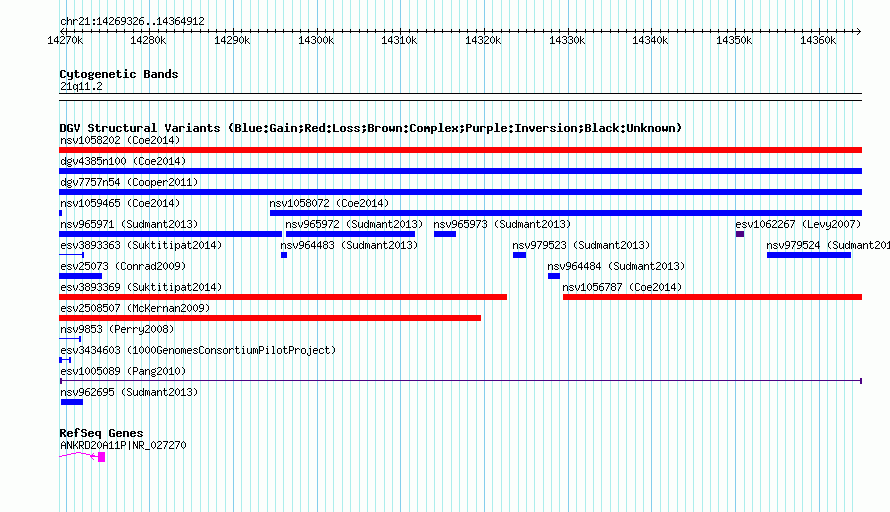 Variant DetailsVariant: esv1005089| Internal ID | 7070185 | | Landmark | | | Location Information | | | Cytoband | 21q11.2 | | Allele length | | Assembly | Allele length | | hg38 | 95587 | | hg19 | 95587 | | hg18 | 95587 |
