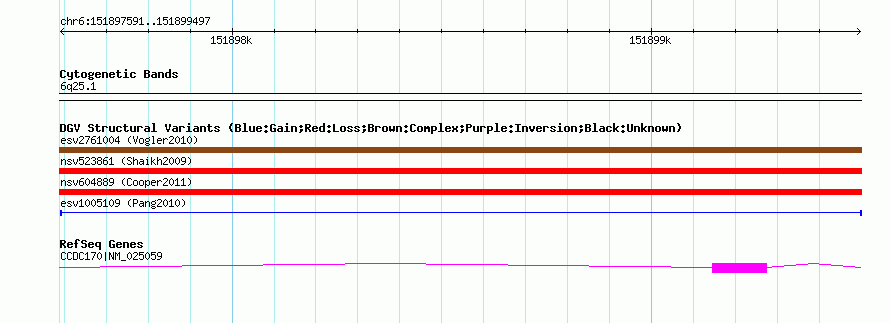 Variant DetailsVariant: esv1005109| Internal ID | 7070205 | | Landmark | | | Location Information | | | Cytoband | 6q25.1 | | Allele length | | Assembly | Allele length | | hg38 | 5266 | | hg19 | 5266 | | hg18 | 5266 |