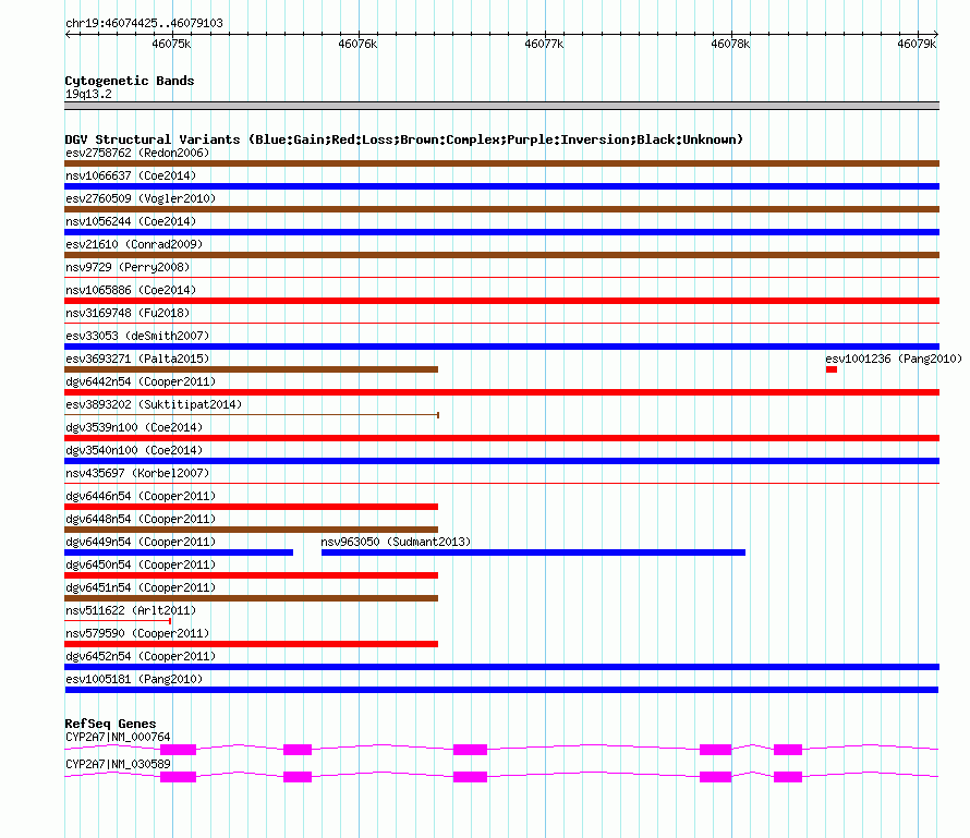 Variant DetailsVariant: esv1005181| Internal ID | 7070277 | | Landmark | | | Location Information | | | Cytoband | 19q13.2 | | Allele length | | Assembly | Allele length | | hg38 | 4679 | | hg19 | 4679 | | hg18 | 4679 |