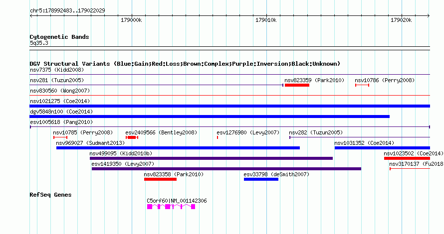 Variant DetailsVariant: esv1005618| Internal ID | 7070713 | | Landmark | | | Location Information | | | Cytoband | 5q35.3 | | Allele length | | Assembly | Allele length | | hg38 | 29547 | | hg19 | 29547 | | hg18 | 29547 |