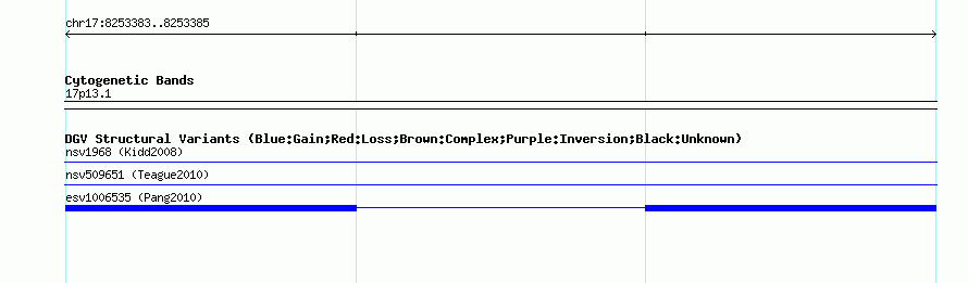 Variant DetailsVariant: esv1006535| Internal ID | 7071629 | | Landmark | | | Location Information | | | Cytoband | 17p13.1 | | Allele length | | Assembly | Allele length | | hg38 | 4443 | | hg19 | 4443 | | hg18 | 4443 |