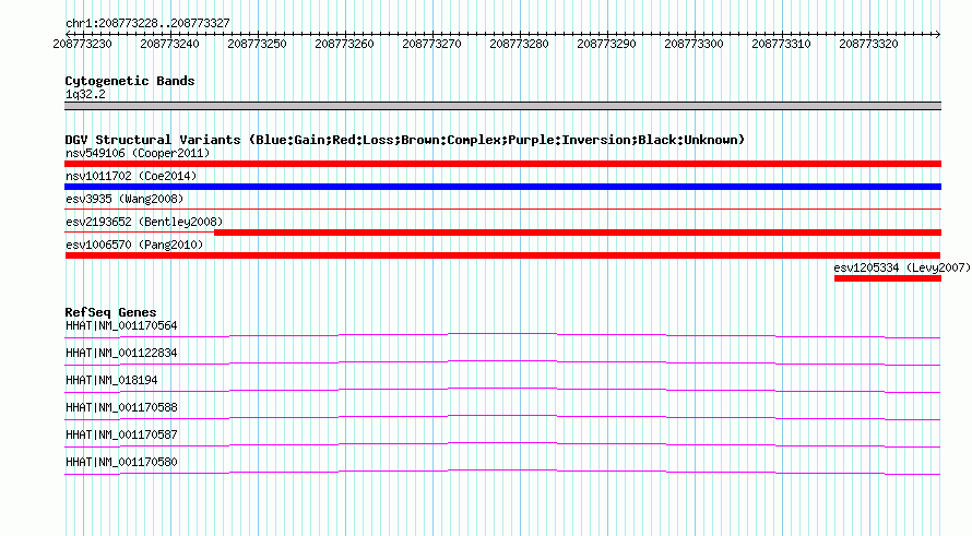 | | Variant Type | CNV deletion | | Copy Number | | | Allele State | | | Allele Origin | | | Probe Count | | | Validation Flag | | | Merged Status | M | | Merged Variants | | | Supporting Variants | essv3578280 | | Samples | HuRef | | Known Genes | HHAT | | Method | Sequencing | | Analysis | | | Platform | Sanger Sequencing | | Comments | | | Reference | Pang_et_al_2010 | | Pubmed ID | 20482838 | | Accession Number(s) | esv1006570