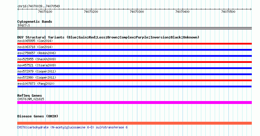 Variant DetailsVariant: esv1007873| Internal ID | 6719983 | | Landmark | | | Location Information | | | Cytoband | 16q23.1 | | Allele length | | Assembly | Allele length | | hg38 | 511 | | hg19 | 511 | | hg18 | 511 |