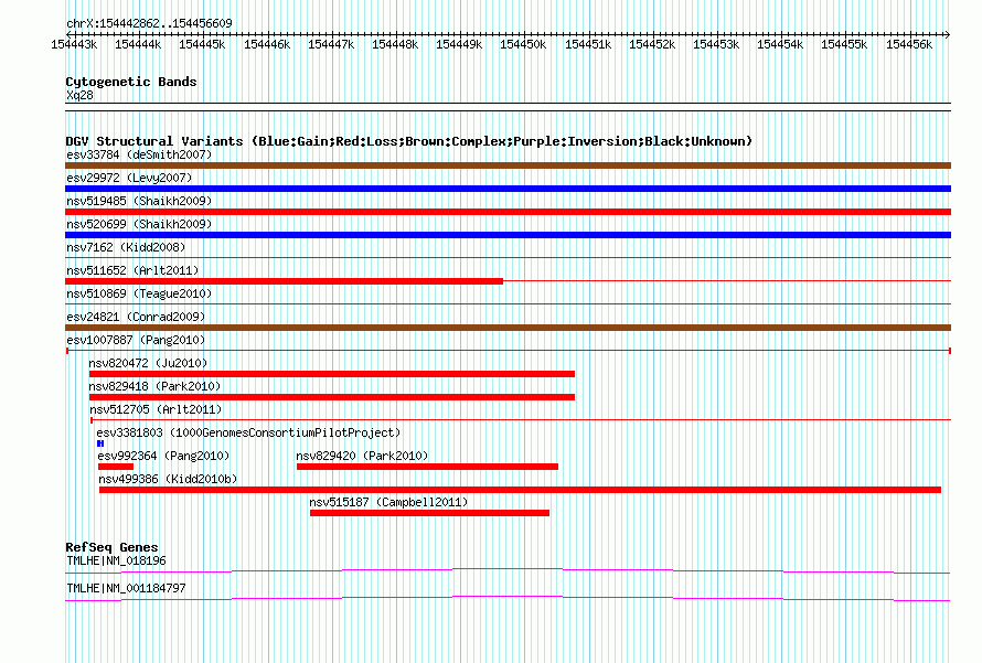 Variant DetailsVariant: esv1007887| Internal ID | 7072980 | | Landmark | | | Location Information | | | Cytoband | Xq28 | | Allele length | | Assembly | Allele length | | hg38 | 13748 | | hg19 | 13748 | | hg18 | 13748 |
