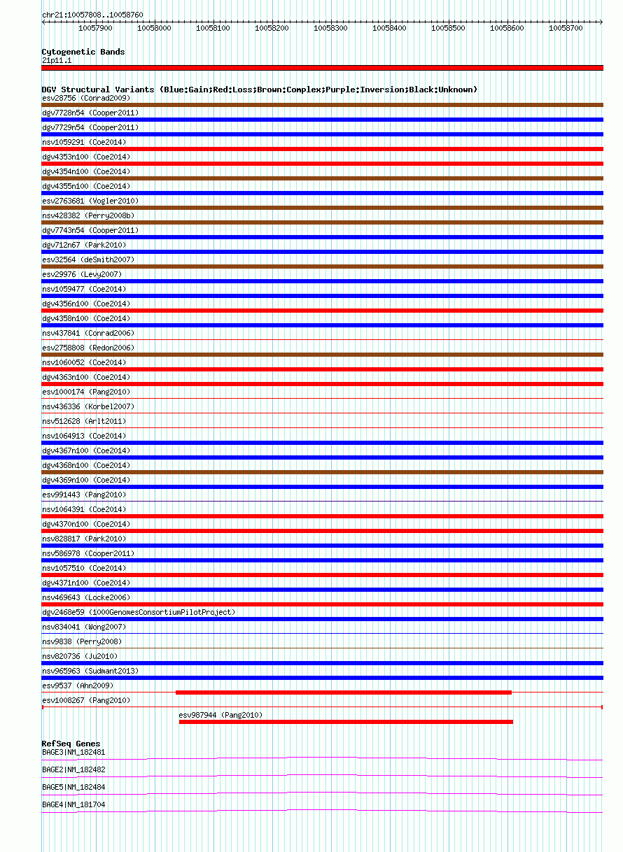 Variant DetailsVariant: esv1008267| Internal ID | 7073359 | | Landmark | | | Location Information | | | Cytoband | 21p11.1 | | Allele length | | Assembly | Allele length | | hg38 | 953 | | hg19 | 953 | | hg18 | 953 |