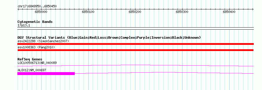 Variant DetailsVariant: esv1008363| Internal ID | 6720473 | | Landmark | | | Location Information | | | Cytoband | 17p13.1 | | Allele length | | Assembly | Allele length | | hg38 | 501 | | hg19 | 501 | | hg18 | 501 |