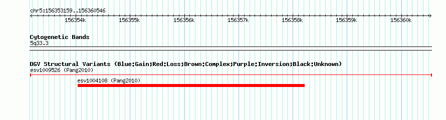 Variant DetailsVariant: esv1009526| Internal ID | 7073933 | | Landmark | | | Location Information | | | Cytoband | 5q33.3 | | Allele length | | Assembly | Allele length | | hg38 | 7388 | | hg19 | 7388 | | hg18 | 7388 |