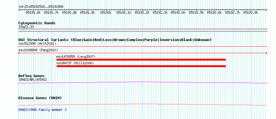 | | Variant Type | CNV deletion | | Copy Number | | | Allele State | | | Allele Origin | | | Probe Count | | | Validation Flag | | | Merged Status | M | | Merged Variants | | | Supporting Variants | essv3563913 | | Samples | HuRef | | Known Genes | SMAD3 | | Method | Sequencing | | Analysis | | | Platform | Sanger Sequencing | | Comments | | | Reference | Pang_et_al_2010 | | Pubmed ID | 20482838 | | Accession Number(s) | esv1009806