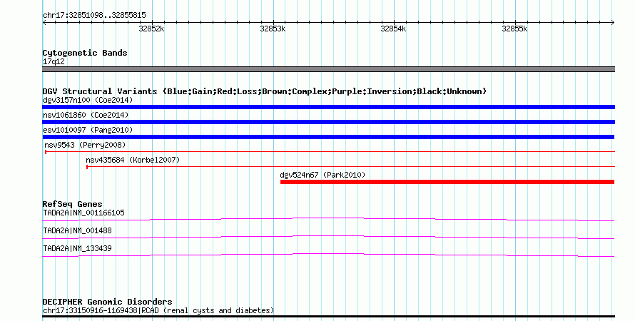 Variant DetailsVariant: esv1010097| Internal ID | 7074162 | | Landmark | | | Location Information | | | Cytoband | 17q12 | | Allele length | | Assembly | Allele length | | hg38 | 4720 | | hg19 | 4718 | | hg18 | 4718 |