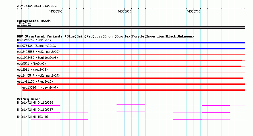 Variant DetailsVariant: esv1011150| Internal ID | 7059912 | | Landmark | | | Location Information | | | Cytoband | 17q21.32 | | Allele length | | Assembly | Allele length | | hg38 | 330 | | hg19 | 330 | | hg18 | 330 |
