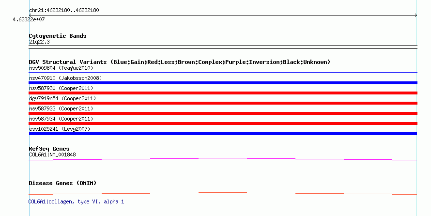 Variant DetailsVariant: esv1025241| Internal ID | 12188366 | | Landmark | | | Location Information | | | Cytoband | 21q22.3 | | Allele length | | Assembly | Allele length | | hg38 | 397 | | hg19 | 397 | | hg18 | 397 |