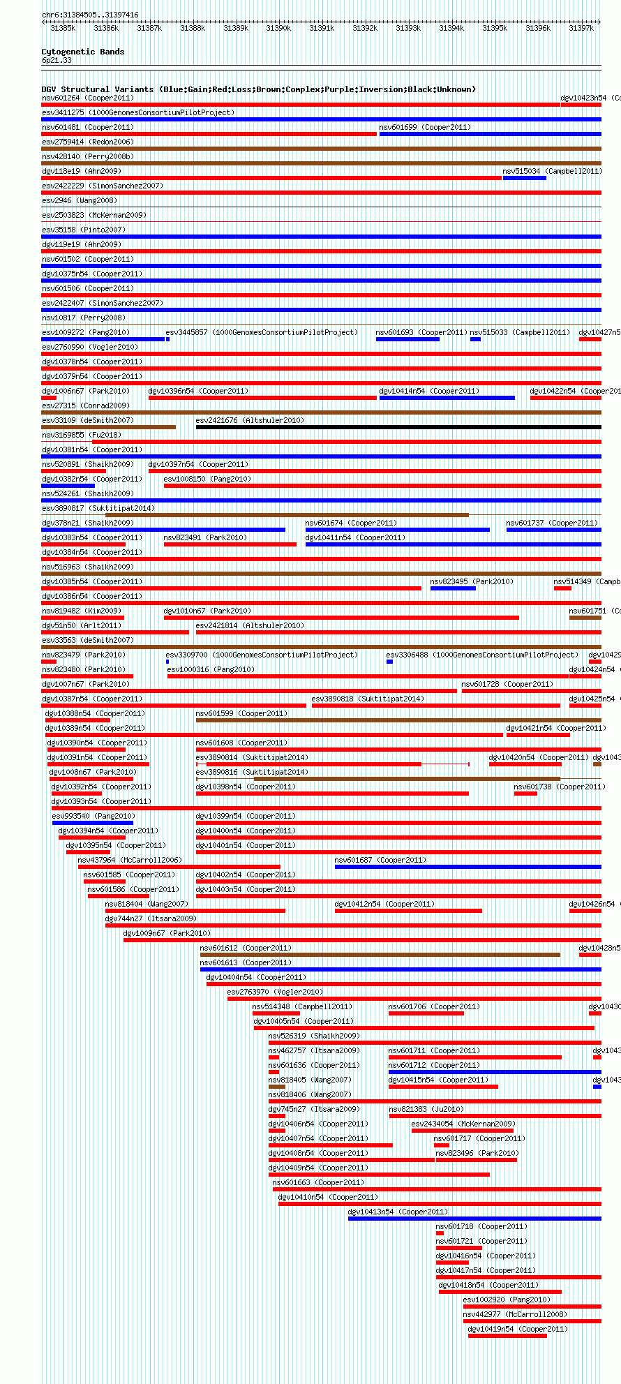 Variant DetailsVariant: esv10535 | Internal ID | 11374454 | | Landmark | | | Location Information | | | Cytoband | 6p21.33 | | Allele length | | Assembly | Allele length | | hg38 | 12912 | | hg19 | 12912 | | hg18 | 12912 |
