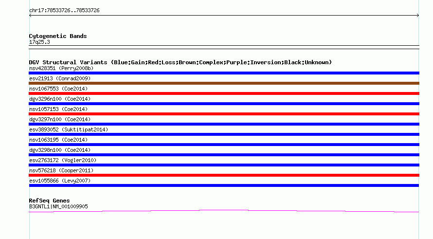 Variant DetailsVariant: esv1055866| Internal ID | 12218991 | | Landmark | | | Location Information | | | Cytoband | 17q25.3 | | Allele length | | Assembly | Allele length | | hg38 | 58 | | hg19 | 58 | | hg18 | 58 |