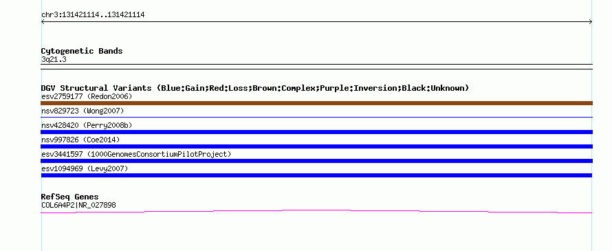 Variant DetailsVariant: esv1094969| Internal ID | 12258094 | | Landmark | | | Location Information | | | Cytoband | 3q21.3 | | Allele length | | Assembly | Allele length | | hg38 | 321 | | hg19 | 321 | | hg18 | 321 |