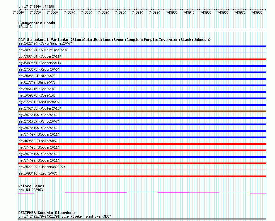 Variant DetailsVariant: esv1098416| Internal ID | 12261540 | | Landmark | | | Location Information | | | Cytoband | 17p13.3 | | Allele length | | Assembly | Allele length | | hg38 | 145 | | hg19 | 145 | | hg18 | 145 |