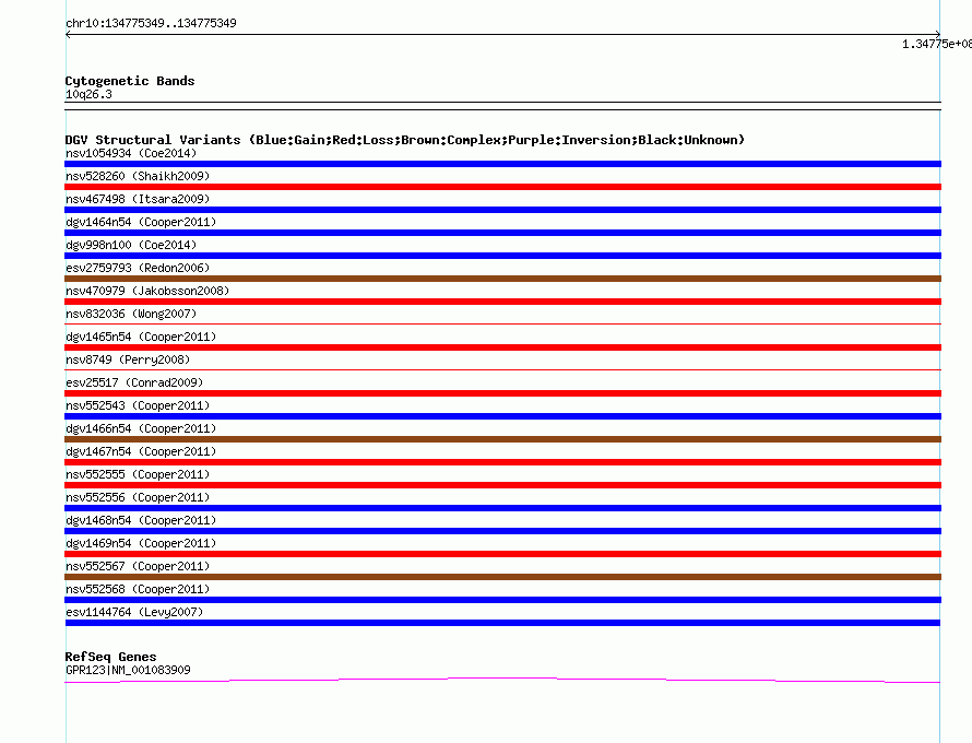 Variant DetailsVariant: esv1144764| Internal ID | 12307887 | | Landmark | | | Location Information | | | Cytoband | 10q26.3 | | Allele length | | Assembly | Allele length | | hg38 | 252 | | hg19 | 252 | | hg18 | 252 |