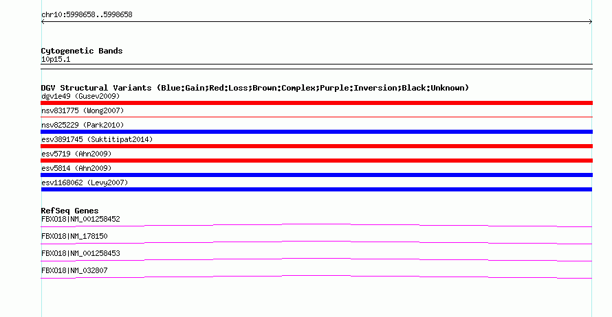Variant DetailsVariant: esv1168062| Internal ID | 12331185 | | Landmark | | | Location Information | | | Cytoband | 10p15.1 | | Allele length | | Assembly | Allele length | | hg38 | 164 | | hg19 | 164 | | hg18 | 164 |