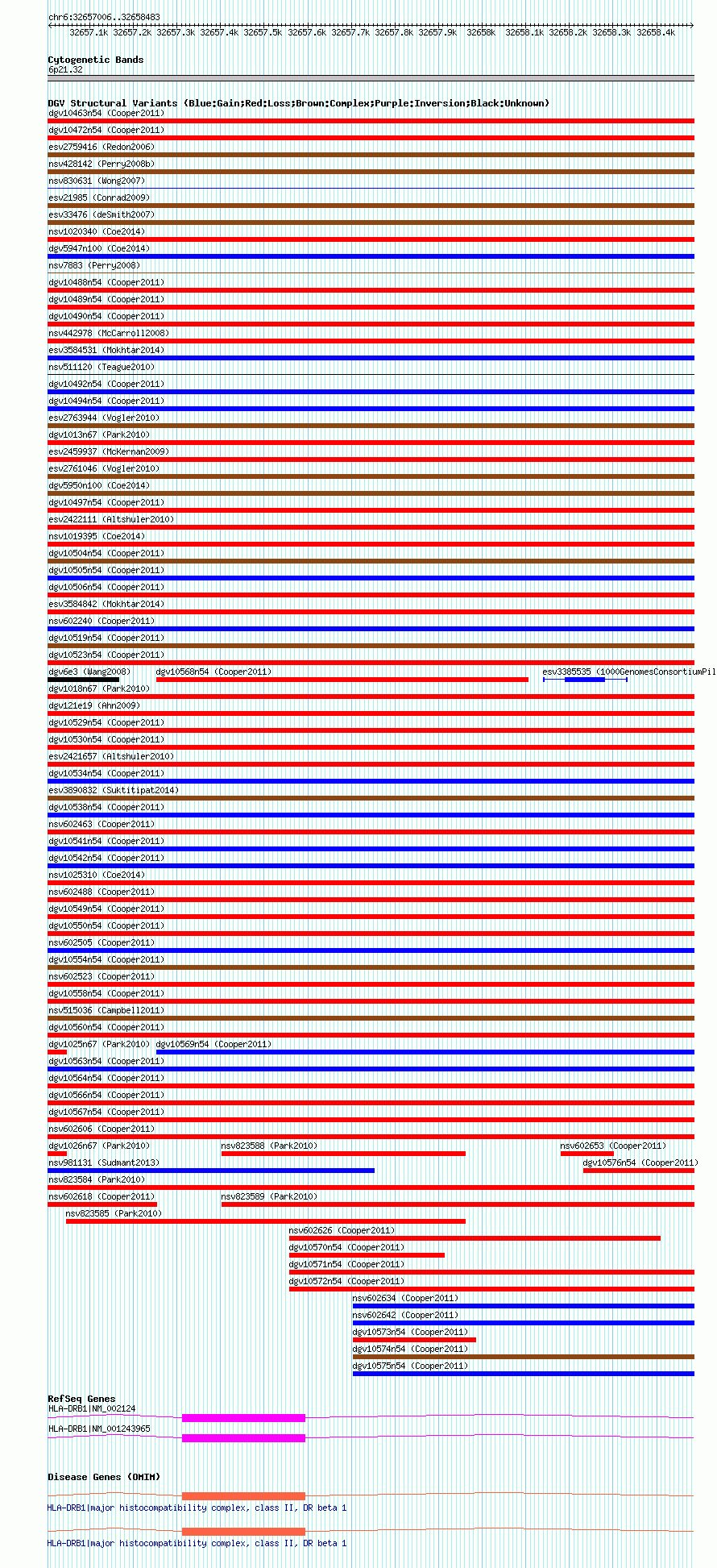 | Variant DetailsVariant: esv11852| Internal ID | 11029086 |  | Landmark |  |  | Location Information |  |  | Cytoband | 6p21.32 |  | Allele length | | Assembly | Allele length |  | hg38 | 1478 |  | hg19 | 1478 |  | hg18 | 1478 |