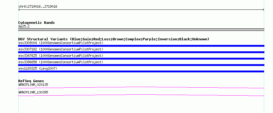 | | Variant Type | CNV insertion | | Copy Number | | | Allele State | | | Allele Origin | | | Probe Count | | | Validation Flag | | | Merged Status | M | | Merged Variants | | | Supporting Variants | essv3853971 | | Samples | HuRef | | Known Genes | WRNIP1 | | Method | Sequencing | | Analysis | | | Platform | Sanger Sequencing | | Comments | | | Reference | Levy_et_al_2007 | | Pubmed ID | 17803354 | | Accession Number(s) | esv1193325